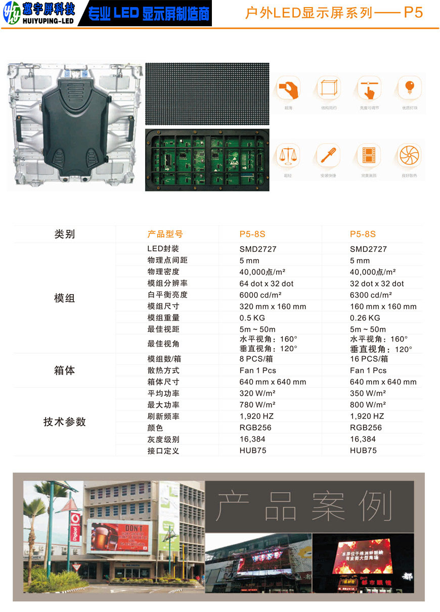 蕙宇戶外P5全彩LED顯示屏價格采取直銷政策,廠家直接銷售,安裝和售后維護,價格更實惠,大小可任意定制